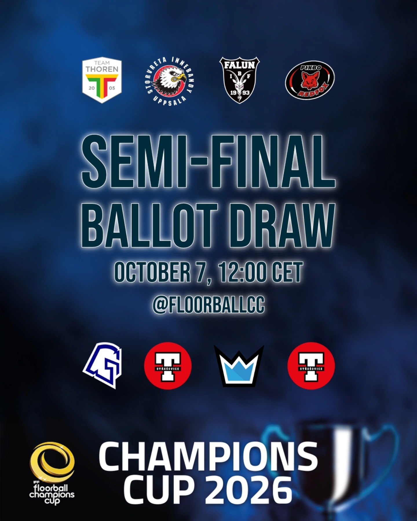 The Champions Cup semi-final matchups are decided by a ballot draw on Tuesday 7th October 2025 at 12:00 CET. You can follow the ballot draw live on the Floorball Champions Cup Instagram (@floorballcc).
