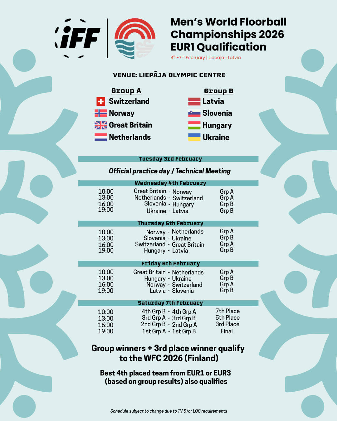 Teams: Switzerland, Norway, Great Britain, Netherlands in Group A and Latvia, Slovenia, Hungary, Ukraine in Group B